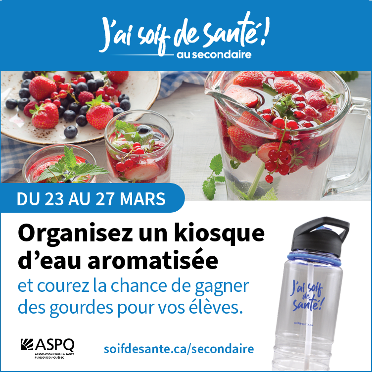 Du 23 au 27 mars 2026, les écoles secondaires sont invitées à choisir une journée pour organiser un kiosque de dégustation d’eaux aromatisées et sensibiliser les jeunes à l’importance d’une saine hydratation.